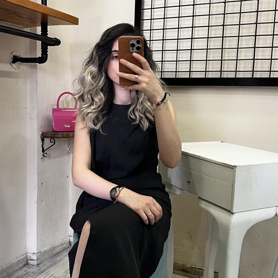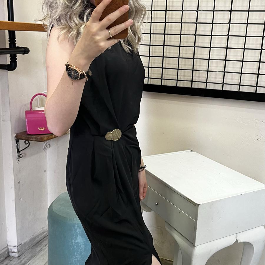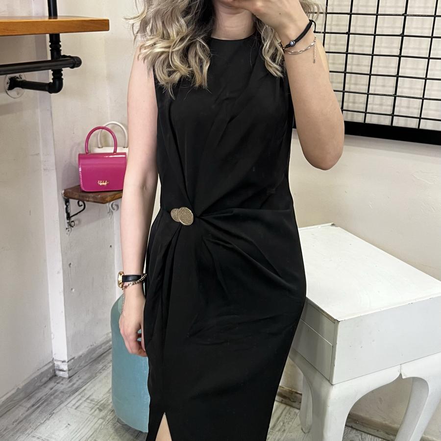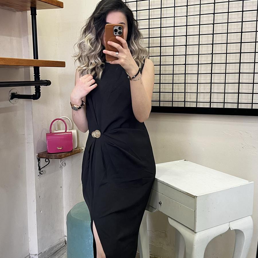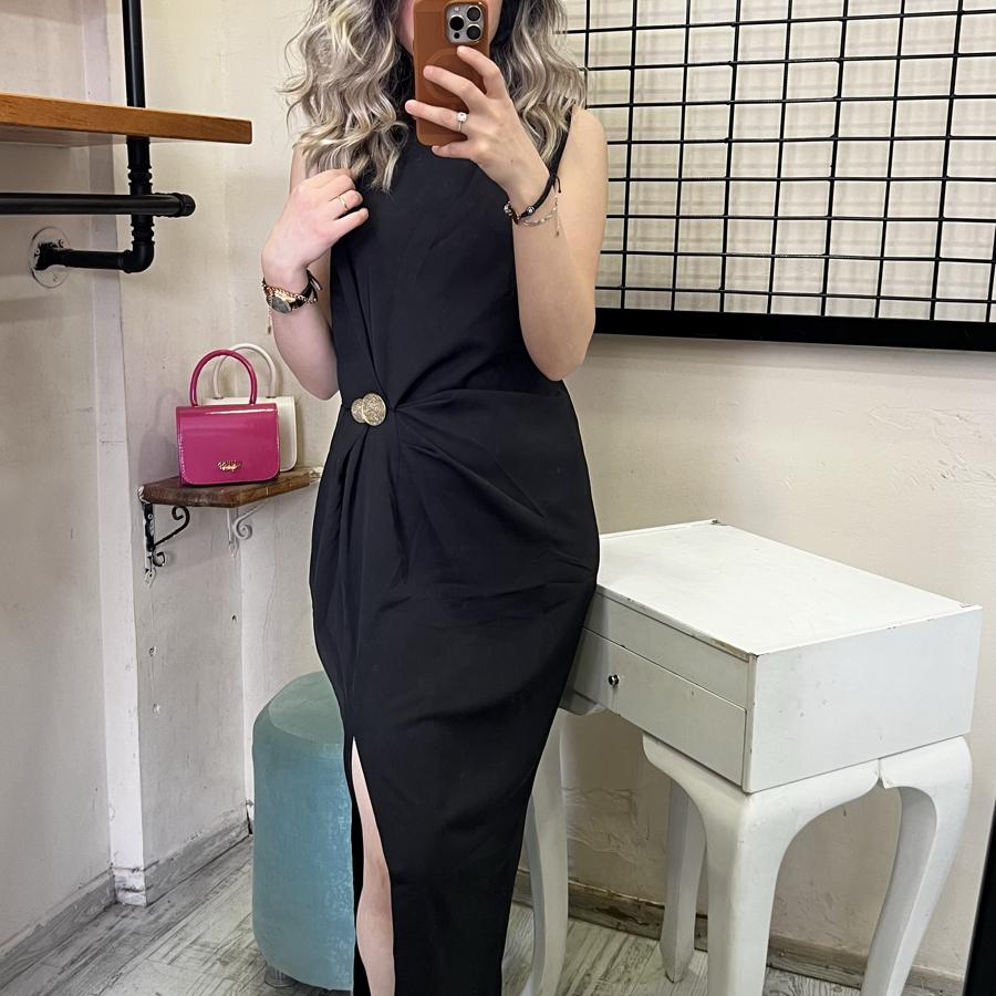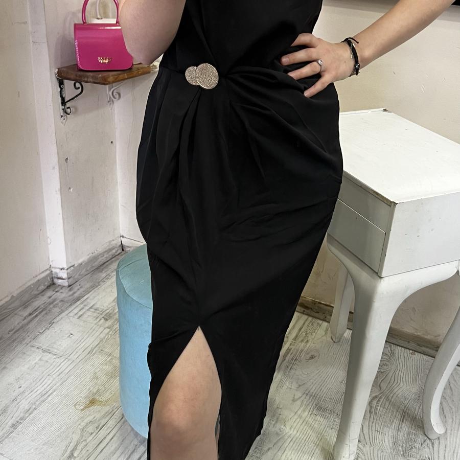 QSTYLE BELDEN BAĞLAMA YIRTMAÇLI SİYAH ELBİSE S/M/L BEDEN